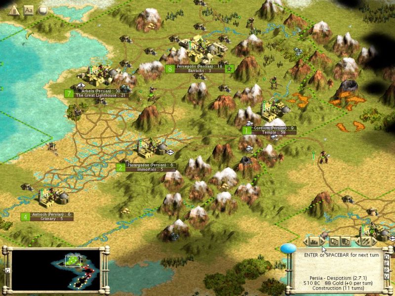 Problem is that you need cities producing Settlers and Workers pretty early on. Things grow exponentially as time goes on, so while you have 2 cities doing Settlers in your game, I have 4 doing so in mine. Which means I'll continue growing faster and faster compared to you.I have Arbela doing the one wonder it is working on, if it can and two are cities making settlers and one troops, well two if you count AC's.