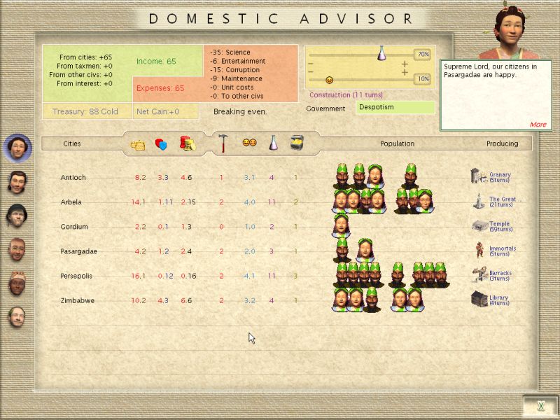 I have Arbela doing the one wonder it is working on, if it can and two are cities making settlers and one troops, well two if you count AC's.