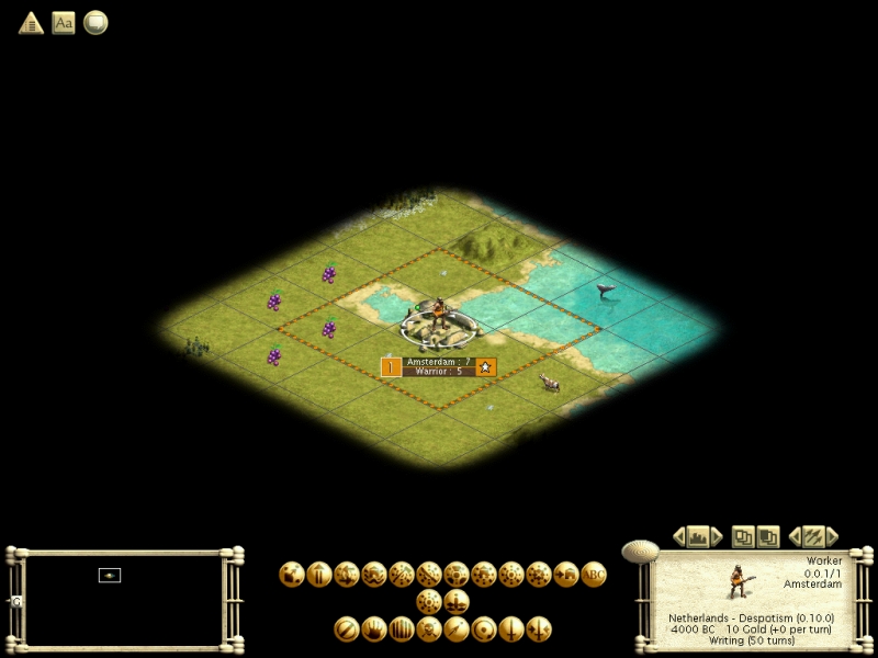 This is where I am... it's almost embarassing to me, in terms of the lack of development. This is at Emperor, btw, so I am disadvantaged, but have caught up with Writing, and can already see that my positional / terrain advantage will give me the game. Arrian's UP... but harder!
