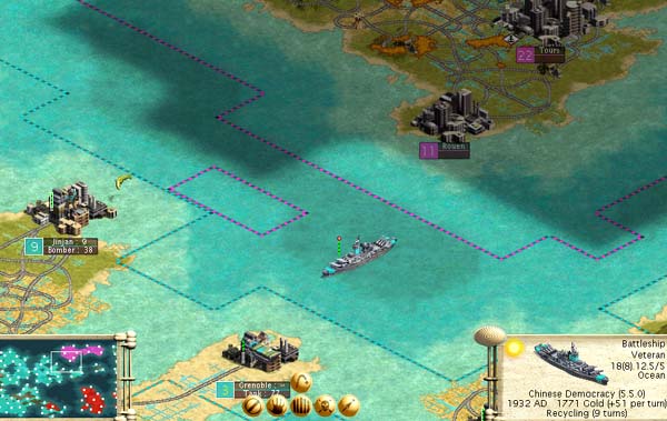But first, I finally confirmed my initial report about the submarine bug. When I used the goto command on my battleship I happened to run into a hidden submarine belonging to the French, who I was at peace with at the time. Immediately my battleship opened fire, without giving the usual warning, and sank the sub. When I then opened the domestic advisor I was now at war with the French.