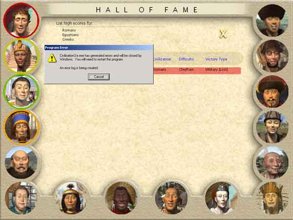 in the raning screen with all the leaders lining your rank, if you click the top left leader and work your way down, it highlights ALL the leaders (well, at least the first four anyway) then it crashes with a civ3.exe error. it happens repeatedly.