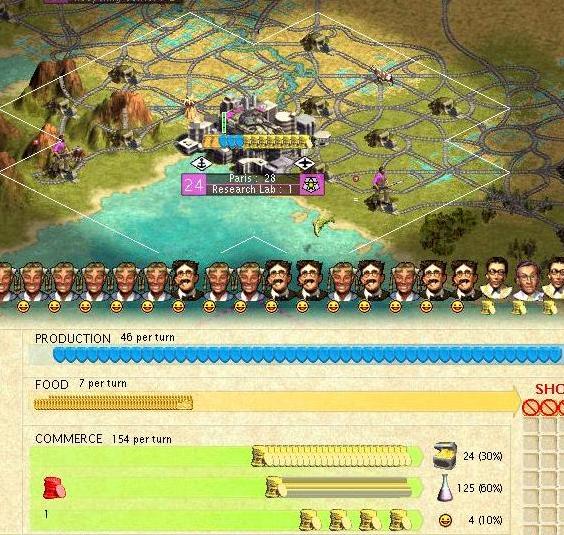 Apparently what's going on is a stacking effect - I polluted on those mountain tiles (4 shields, 3 commerce) several times, and cleared it immediately, then set the worker back to work. Each time the square was polluted, I suppose that the production was not altered to reflect the polluted square was not being worked, and putting the worker back to work simply stacked the production of the old square back on to the total. A few times I polluted on one of the mined grasslands, and you can see that Paris' food is getting a +5 bonus from nowhere. My game includes many other examples - a size 32 city just out of range of the cropped shot is getting a +10 food bump from nothing at all.