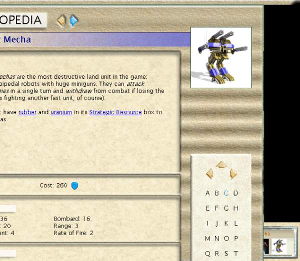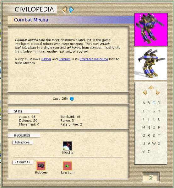 I have a problem. I've added a unit called Combat Mecha sucessfully, but I don't understand how to get its Civilopedia icon to work. In the attached image, you'll notice that the icon is taken from the units_32.pcx file. Below that is the icon I want to use, which I just pasted on top of the screenshot.