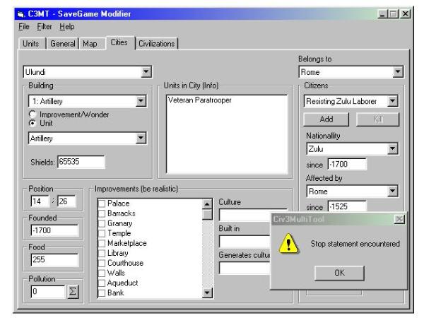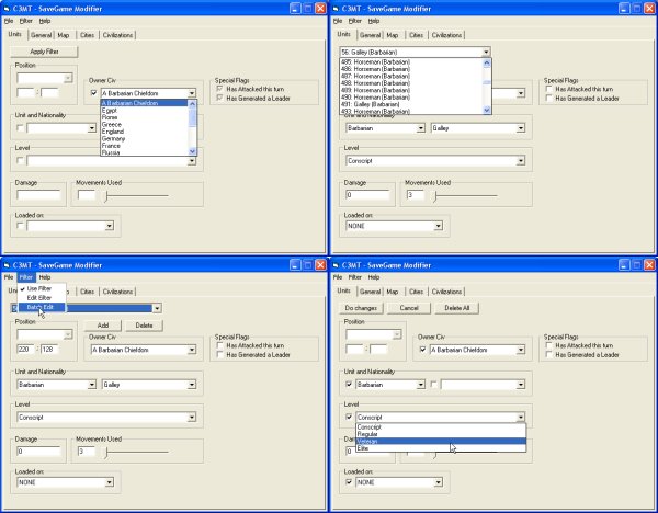 how about making a little larger window (like the one where u chose attributes of unit in civ3edit) for unit list? So u can chose many units at a time... cuz when u play on a huge map, it turns veeeeeeeery slow because of a huge ammount of units so that's be nice to have a way to delete some of them, sometimes