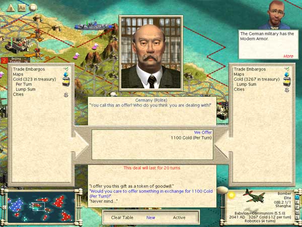 I've noticed anouther problem in diplomacy. It was late game, and I'm trying to win via diplomacy (I don't know what it takes for other people to vote for you, if anyone knows I'd love to know), but in any case, I'm trying to improve relations, because I thought that would help. I offered Germany 10 gold per turn, and they said that they were insulted! So I offered 20. Same thing. So I saved, and wanted to see how high I could go. After getting to 1100 gold, I just gave up. I have a screenshot, but it's a little big, I'm in the process of shrinking and resizing it, I'll post it later tonight. But what's the deal? I'm offering 1100 gold PER TURN as a gift, and they're yelling at me? I don't get it. Same thing with making peace terms with China. I got 747 gold lump sum (all they had), 5 cities each with 1 population (I've noticed the AI will only give away cities with 1 population, but they only look at population. Germany earlier in the game gave me Moscow as a peace treaty, but only after I bombed it to 1 population. It has 4 great wonders in it). But when I asked China for just 1 gold per turn, they immediatly got their panties in a bunch. So I'm guessing the AI is having a hard time with gold per turn, everything else seems to be working. Hopefully Firaxis will be getting a patch out soon, or are we gonna have to wait for the expansion?
