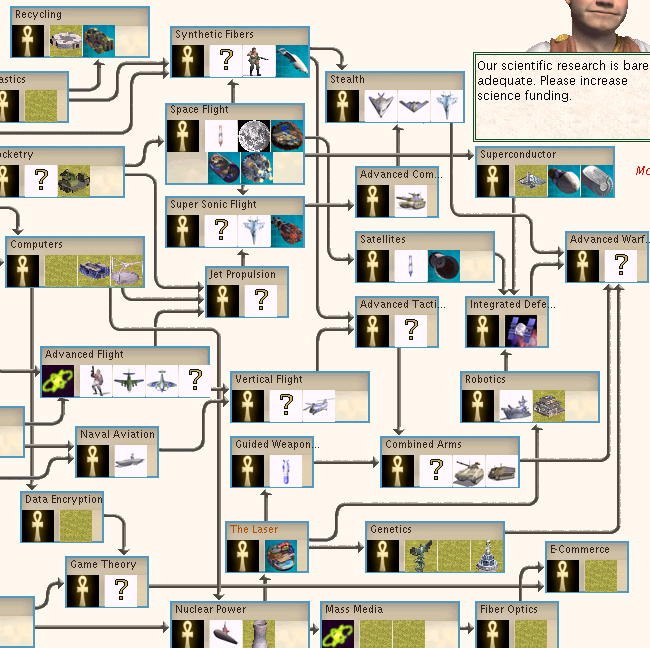 the icons could use some adapting. a symbol of an atom doesn't fit to "advanced flight" and that monotheistic icon isn't very representative for synthetic fibers