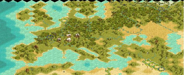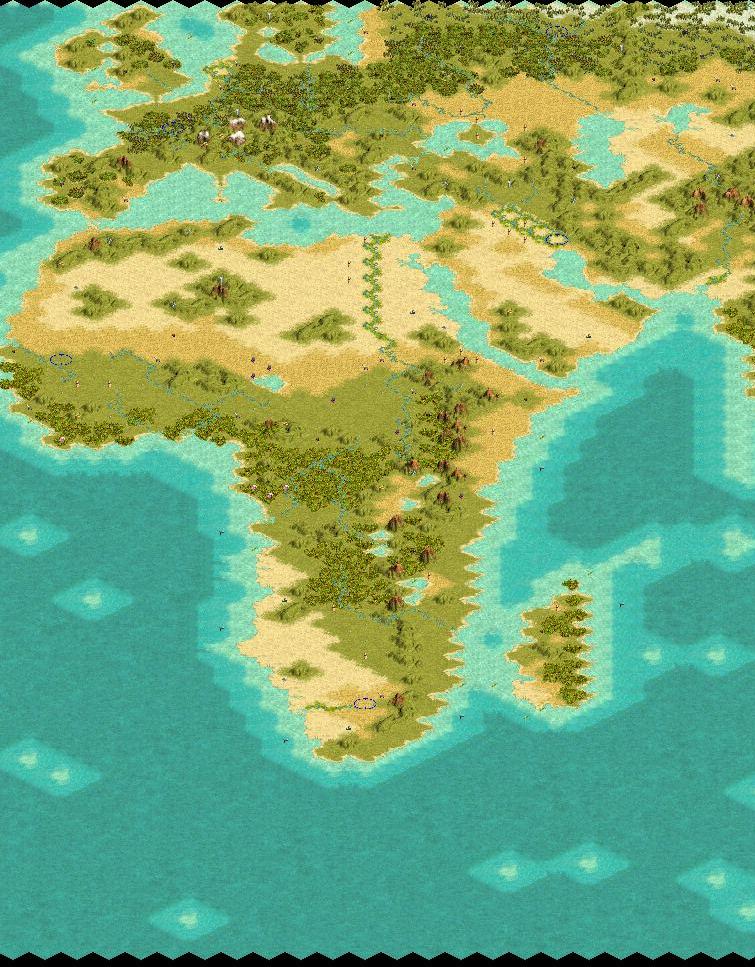 This map is an attempt to render an accurate earth map with as little distortion as possible. This was done by using a mercator-like projection and cuting off the top and bottom at 60* lattitude (roughly the artic and antartic circle). This has two benefits...as stated above it reduces distortion greatly, and two it prevents massive artic empires in northern Russia and Canada...those of you who play against cpus on most earth maps know what I am talking about