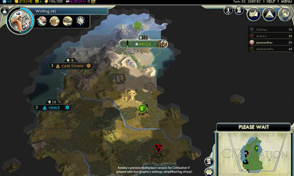 Stephen Totilo tells us how to beat three other people in Multiplayer in an early Civilisation V built. However, he made the mistake to place the capital of Arabia into the desert as it is historically accurate, and for performance he turned super shiny graphics off so that the fog of war looks a little bit hexagonial, but in the end he won, though it was not a time, science, domination, culture, nor diplomatic victory, but just a score victory.