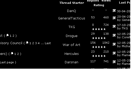 This is a screenshot of how I see Apolyton, with the star thread ratings. I presume it has something to do with the style you are using for Apolyton. My guess is you're using a "Light" forum style, while the thread ratings can only be seen on a "Default" style.