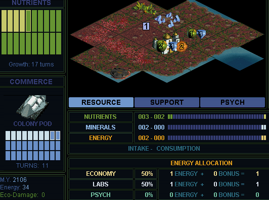 2106 - Pod creates another underground river. Start researching Centauri Ecology. Monolith enhances Rover to hardened status. Game stopped, as a name and location need to be determined for second city.