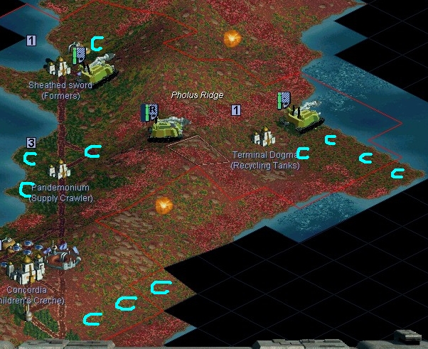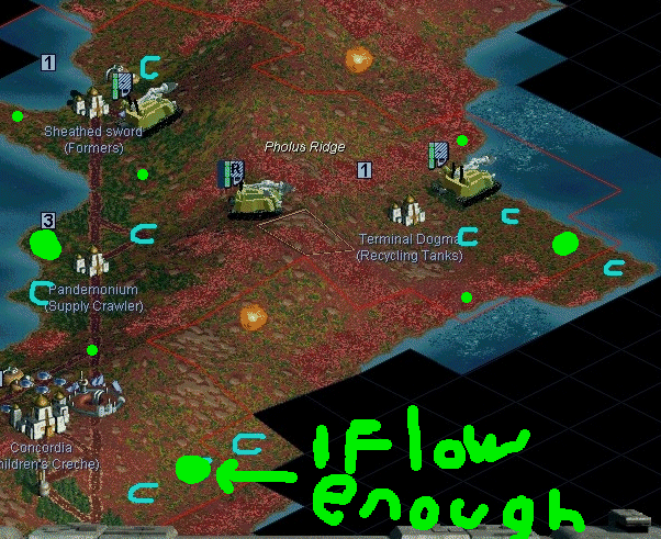 Complete the road to that base; farm&solar (15.67) and forest (17.67) along the road. Then split them in two groups. Group one builds a road to a new base location (try the road to cross the least possible fungus squares). Group two builds a mine&road on (18.68). If finished, build farm/condenser/roads on those flat&moist tiles east of Terminal Dogma.