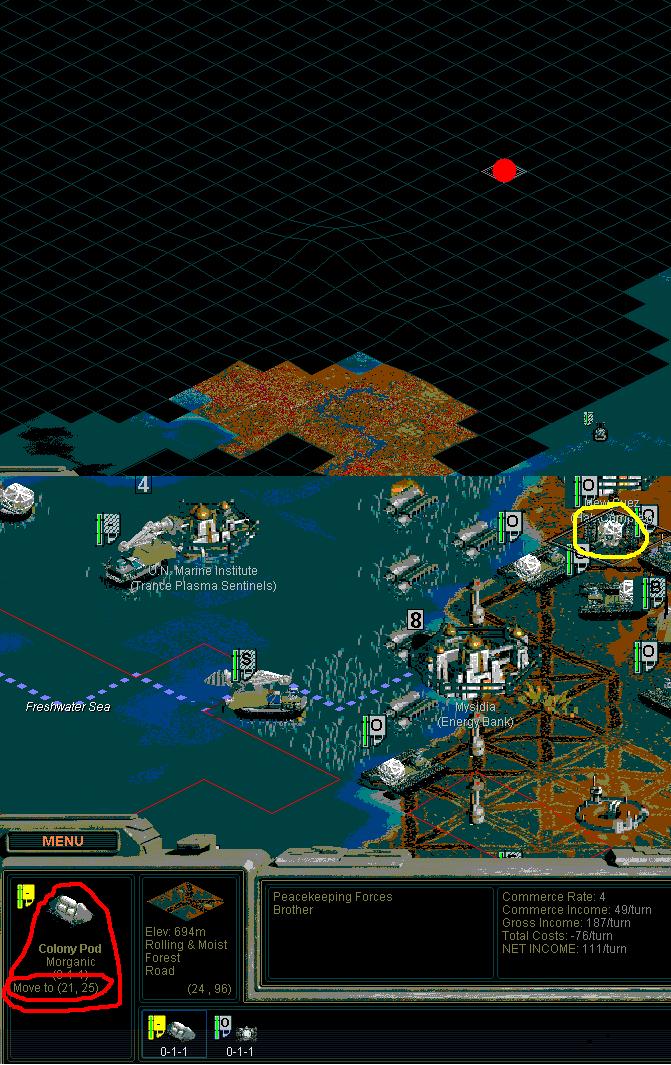 For the last several turns, Morgan has been moving a colony pod through our territory. It is currently just south of New Suez. According to then unit information, acquired through our PAct, it is headed to 21,25 - a square far north that we haven't yet explored, and which is probably covered in fungus.