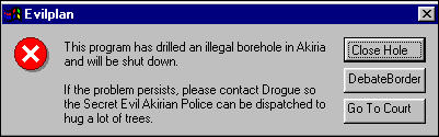 How would you feel, if you lived in a peaceful, beautiful, idyllic base, and then, even though you'd been promised otherwise, a dirty great borehole was built within the base perimiter, near where you worked? It should not be there in the first place, and it is still more harm than good IMHO, and thus I think it should be removed. The fact I feel it is unconstitutional merely means that I can get it removed. It is equidistant between Xanadu and Cyclops, so neither base can claim it to be theirs, thus nothing should be imposed upon either base. Akiria does not want this borehole, and it should not be there.Last edited by Drogue; April 7, 2003, 15:49.Smile