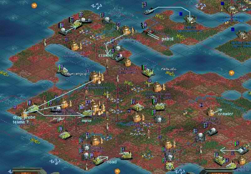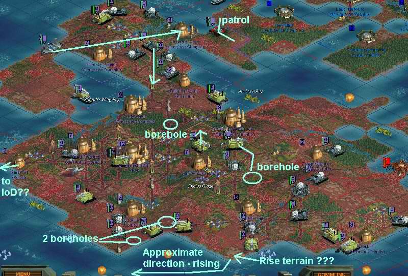 Strength: 15. Even Chaos gun bombers would have difficulties. - About former operations. Some long term plans here. I proposed 2 boreholes south of Googlieplex. Now when I think of it, they would be exposed to attack from the sea. How about rising a terrain there and maybe even making a closed sea? Rising would start near the rocky place marked. Also after rising the terrain we might have potentially more land for boreholes. This tactics I have seen by Krysia's Crusader. Incredible results. Also I would not rise the terrain near the Canyon, as far as I know, the raising destroys the landmark. Let us keep it. So the loop rising from the left might be the option.