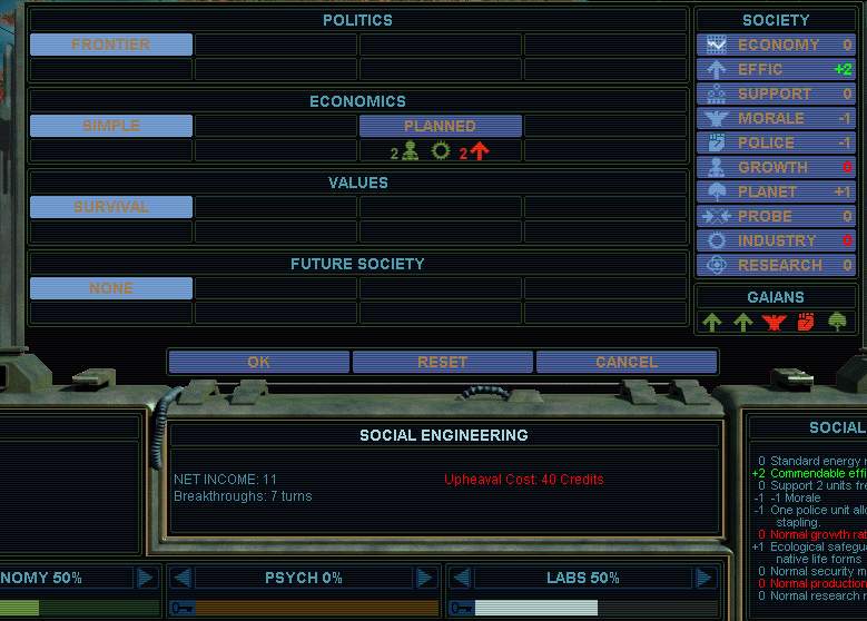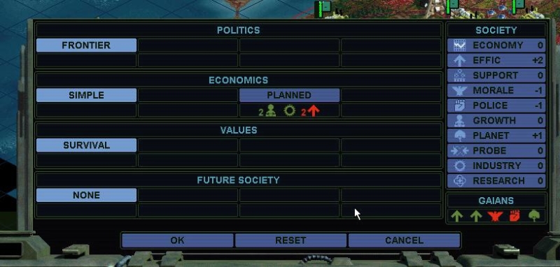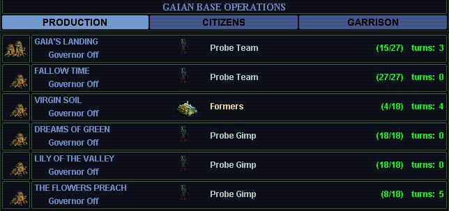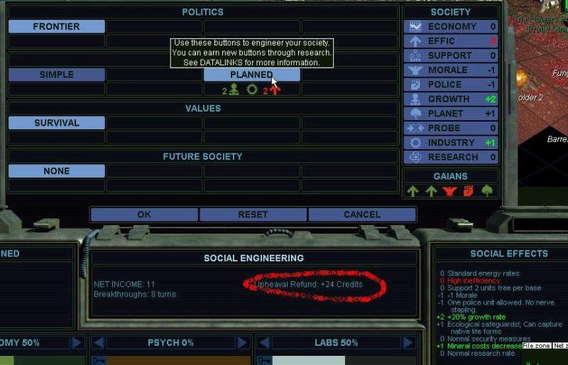 . Captura attempt failed too, but we got a couple of more EC. Oh, with last quarter of movement the youngest MW was moved north revealing end of fungus and some rainy squares. Rover boarded Unity Foil. SL moved along the river to the east. Unity Rover in NewMuirland moved along the river then north. Spore launcher mover SE than E (yes, the fungul tower spawned a fungus square making this possible) - revelaing that fungal tower now has at least three surrounding fungus squares. Of things to do is - hurry production, designate orders for formers and decide what we SL in Angel teritory. Oh and smacksim please tell me what do you seee when you open the SE settings. Every time I open the SE panel the settings show that we are in simple economy and clicking on planned shows refund- +24 credits but no changes. When I close the SE and open it again we are again on simple economics. Am I nuts or is this some kind of bug? Are we in planned or not?