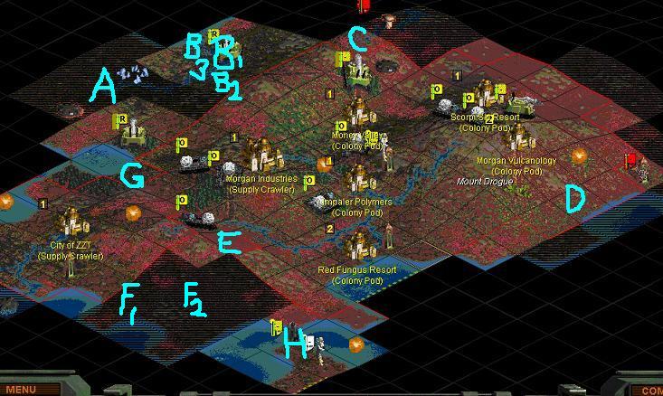 A, B have good resources. A city that can use the eastern monolith (D). F2 because it has less overlap and it's not on the sea (thus can't be hit by a probe foil), and a base near H. Maybe in the future we can terraform some land near H up, so the base would be the only way between the two bodies of water.