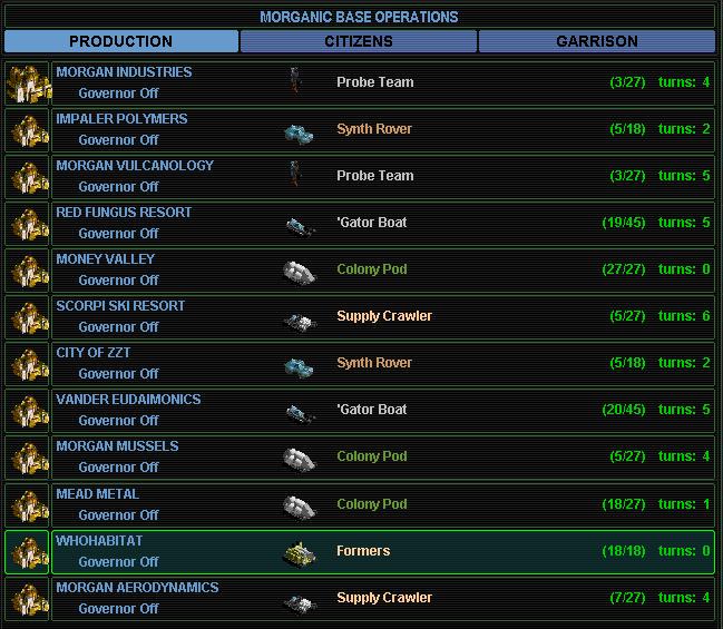 7. As mentioned above, change Morgan Mussels from a CP to a Gator Boat. Rehome 'half an SP on wheels to there to help production, and have that crawler crawl a safe forst square near Morgan Ind.