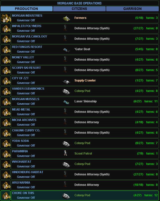 I've made a decision that we need to go to 27 bases. The energy situation is nearly a wash, but we would gain minerals. The thing that tipped the scales for me, though, is in case the Spartans invade, losing say three bases will not impact our overall production nearly as much. The coastal bases can contribute most of the CP's, while the inland bases supply crawlers and formers.