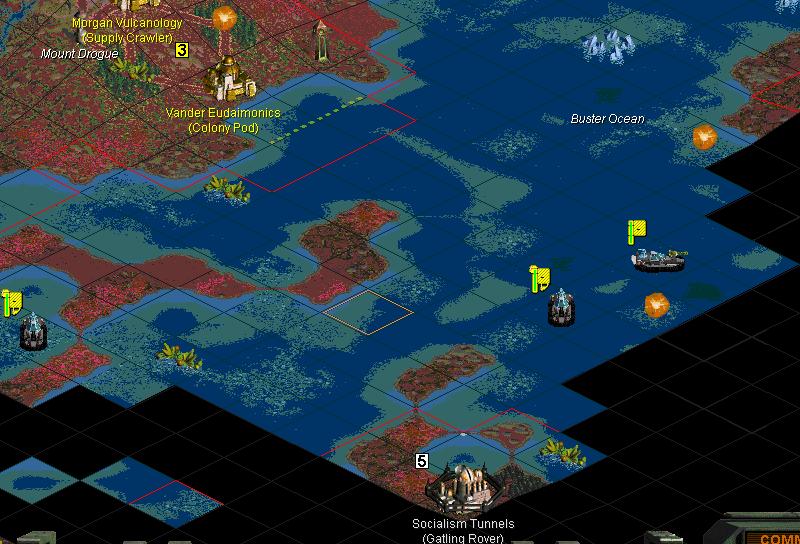 I suppose the Hunter is more or less patrolling, but either it or the companion 'gator boat nearby could head southeast (if there's a sea passage) toward the other human team to the south east. Or, the other 'gator boat near our continent could join up and they could all three head for a spartan coastal city to try infiltrating.