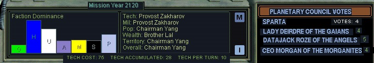 Morgan is about on a par with everyone else - simultaneous first bases (but in 2102), grew to size 4 in 2113 then rushed 2 colony pods and had them planted by 2114 (which makes me wonder if indeed they rushed recycling tanks. I'd have expected their growth to have been faster with the extra nut per base per turn.) These first 2 bases will be about ready to popgrow any time now, so he'll reach size 6 soon as well