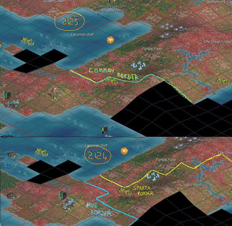 here's the screenies to illustrate - note that in 2125 our borders now meet (and that the Rio Rojo is now completely in our territory) - the only things that changed year over year were that SC2 went to 2 pop, and we founded OA