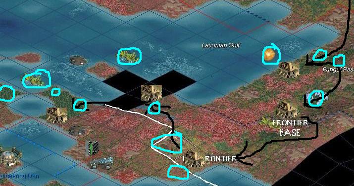 I agree, Primus Pilot, we do need to eventually think about Hive encroachment to the south. If we can just get one base established down there, we can use it to do nothing but pump out garrisons and CPs for future bases. Here's a possible encroachment plan. I agree with Googlie's base site proposal there by the mineral bonus. Here are a few more base proposals. The black arrows indicates the order that we build each base, and the turquoise circles show good, productive squares that each base could harvest.