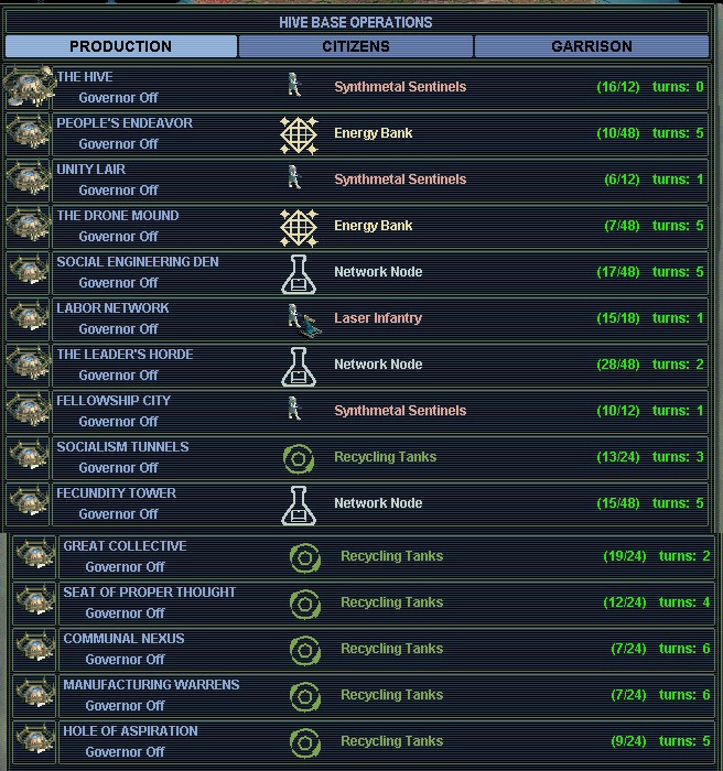 And here's the Hive's Security Nexus for 2140 - note that he doesn't have any trannies, and only 1 probe team (but it's on the move, as it's not showing up in any base's garrison). It is homed to Labor Network (their most southerly base) so I'm assuming it's en-route to infiltrate the Gaians (another bargaining chip for us - I'll cross post this in the gaian diplomacy thread)