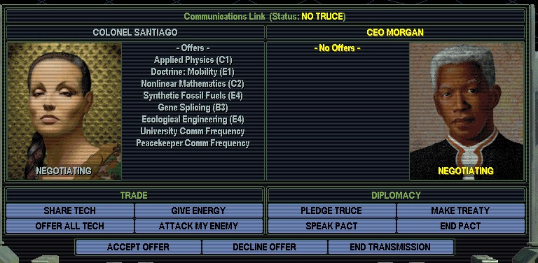 Bad news. Here's the base screen from Fellowship City. That eastern coastal base which SCC Invincible noticed the base sea radius of, before exploring further east. The forces support box shows two laser foils heading straight east. I guess this could mean they're sailing as fast as possible to make contact with Zakharov and Lal, just like Zak's trannie probably heading straight to us as well. This means Yang could in the near future trade DocFlex to Zakharov. With that in mind, that we don't have any monopoly on DocFlex at all and that the tech could soon be widespread, how about we change our previous policy and trade DocFlex to Zak for another tech? (At least if he still needs DocFlex - it's been a while ago we contacted him.)