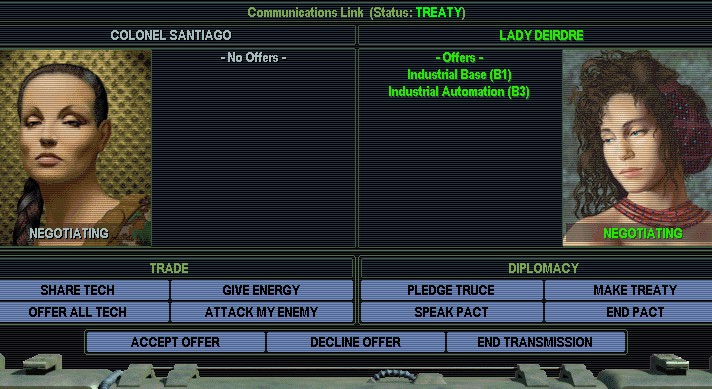 Here's the opening shot - the Gaians were willing to trade, in principle, as they say, so we just need to haggle the terms of a non-transfer and I can put our two techs in pre-accepted