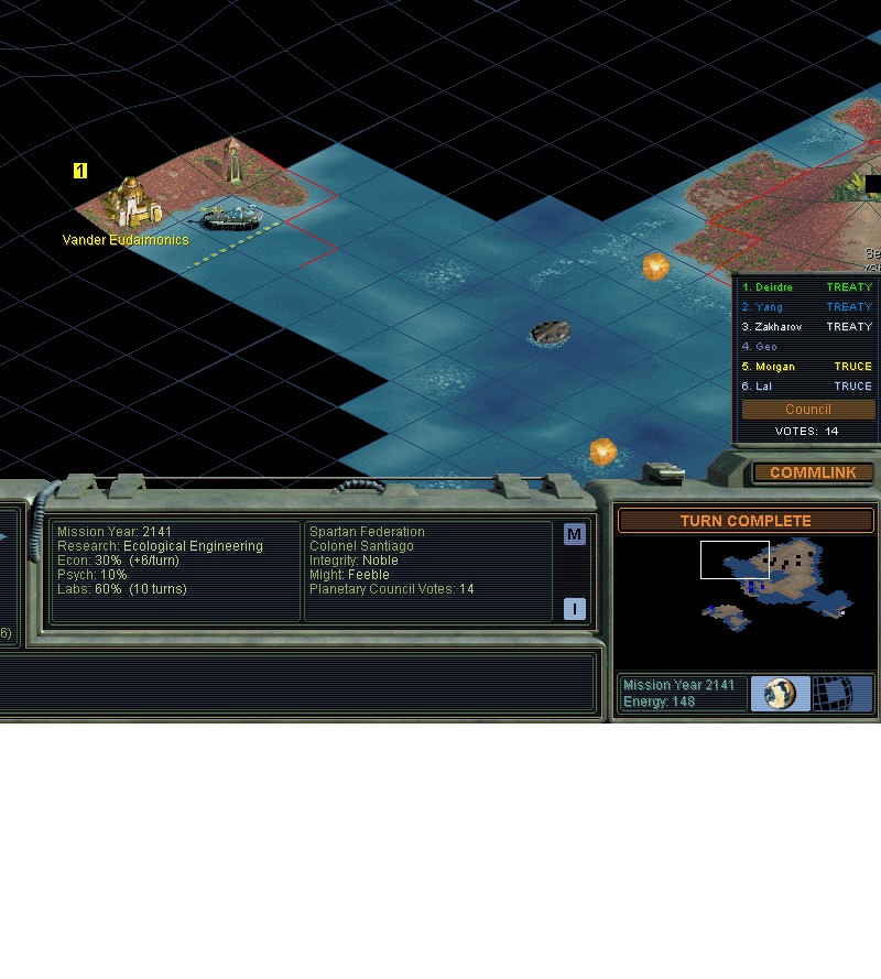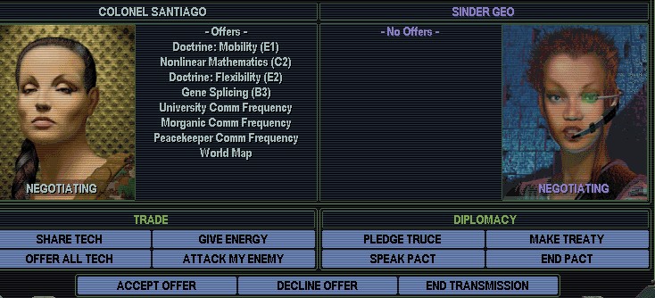 As much as I like the idea of "playing two violins at a time", I don't think pulling any more tricks on the Gaians will be a good idea if we want to keep our relations to them warm. We'll see if we could trade Gene Splicing for something else from them. Heck, the Gaians and Morganites might be encouraged by that to work together and to agree that neither will agree to a term longer than 5 years.