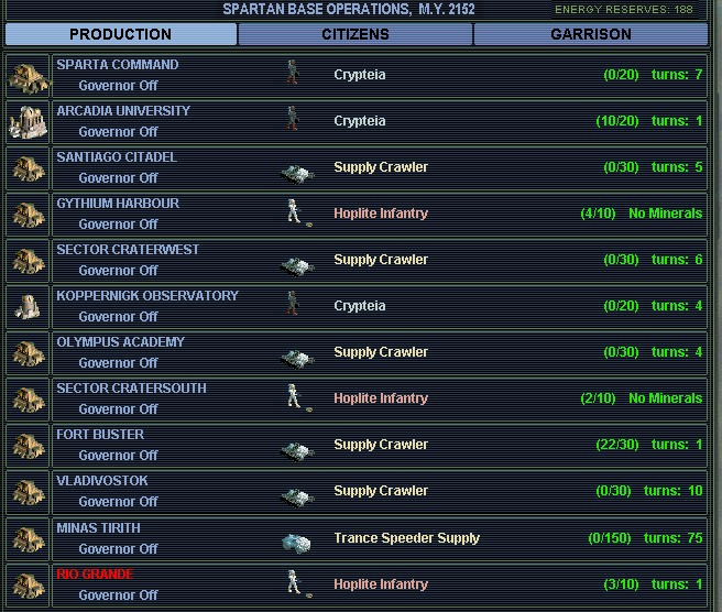 Re Vladivostok, that will need a hoplite in five turns when the base grows to size 2. What would you prefer? Build the hoplite in Vlad (and thus build no crawler), or as you suggest hurry the hoplite in GH when VV is about to grow, and use that to be able to garrison Vlad (through a chain move: GH to SC2, SC2 to OA, and a OA hoplite to VV)?