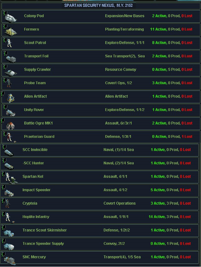 Small suggestion: Re the synth rover I've been thinking about a possible alternative. What do you think about this: We could always first upgrade the new trance skirmisher at the monolith to elite before moving to VV. If SNC Mercury ends its 2152 turn in Amursky Bay (68.12), in MY 2153 the 3-MP skirmisher could still catch the transport before it leaves for Arcadia. A drawback of this is of course the Mercury couldn't for example end its turn on (70.10), which would allow the transport to reach Arcadia University two MPs earlier.