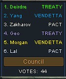 Relations are not soured by words but by actions. Please understand that asking for tactical pact while secretly mapping Gaian coast deeply insulted High Coucil. Your threat did not help much either. If you show you changed your attitude High Council will be happy to cooperate with you as it does easily with Angels. However High Council is now seriously convinced that Junta is preparing for inevitable invasion of Gaian Union. Due to your past actions and as such, you'll need to prove yourself to be trusted. Our past actions? Could someone recap to me, what it is we've done to them? All I remember is a little disagreement over whether or not a deal had been agreed upon yet.