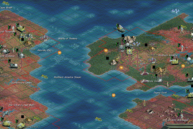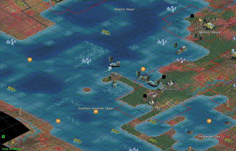 Finally, here's the southern un-named ocean - the 2 remaining PK bases (the UN Aid Station captured base is to the north on the coast) and the Data Angels.