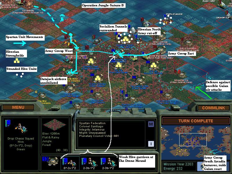 I suspect that once Socialism Tunnels is hopelessly surrounded, Yang will either impotently hold his units there indefinitely, air-drop his drop units to his southern cities, and/or try to set sail with those forces (Yang has a transport in Socialism Tunnels). If Yang did that, though, I think he would find that this isn't Dunkirk, and his units, in this instance, would be dead-meat. If Yang tries to air-drop his drop units to his southern cities, that just bolsters the barrier between us and the Gaians. If Yang just keeps his units impotently bunkered in Socialism Tunnels, they are of no significance, and they will just cost Yang minerals in support costs.