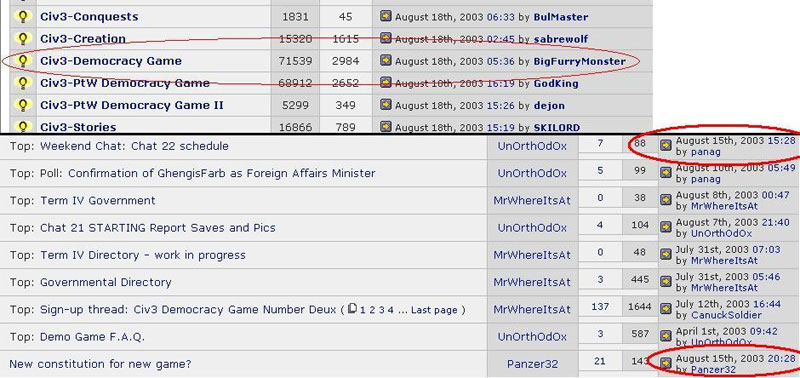 Recently, I've been having a very odd problem. I can't see any of the new posts/threads in the Civ3-Democracy Game forum, but I know that new posts do exist. On the main forum page, the light bulb next to the Civ3- Democracy Game forum is lit up, and in the Last Post column it says 'August 18th, 2003 05:36 by BigFurryMonster' (or something along those lines,) but when I enter the forum, the last post was on August 15. And it has remained like that for several days, even though there are new posts.