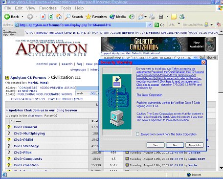 And yes, pop-ups are occuring more frequently now - it used to be only when I first logged on - now it's throughout the time that I send on Apolyton. Don't get me wrong, if these added pop-ups help Apolyton out, then I'm Ok with it...as long as no spyware is installed on my system (ie, Gator).