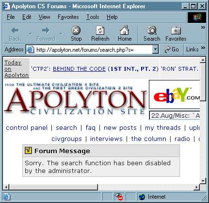 I plan on re-enabling the "Search" function as soon as Apolyton's hosts, RackShack, installs the requested memory upgrade (see http://apolyton.net/about for related discussion).