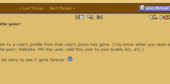 Yesterday I noticed that the link to a user's profile from that user's posts has gone. (You know when you read a post, there are a series of links directly above the post: Website, PM this user, Add this user to your buddy list, etc.)