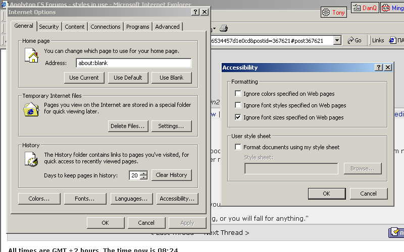 Markos, please keep in mind when designing these styles that not all browsers display them the same. I am using Netscape 4.75 on a Macintosh, and much of the text (for example: time of last post in thread, posters' registration dates and locations, signatures, etc) is so small as to be totally illegible. I would appreciate it if this were to change in the near future.