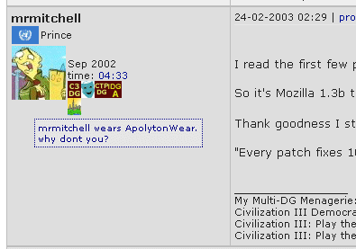 about mozilla: i guess it's the beta in 1.3b that makes it like this. hopefully they'll correct this. 1.2 was awful! iirc they had to release an unscheduled 1.21 just a few days after (a bit like patch 1.16f sucked and 1.17f corrected some severe problems in civ3)