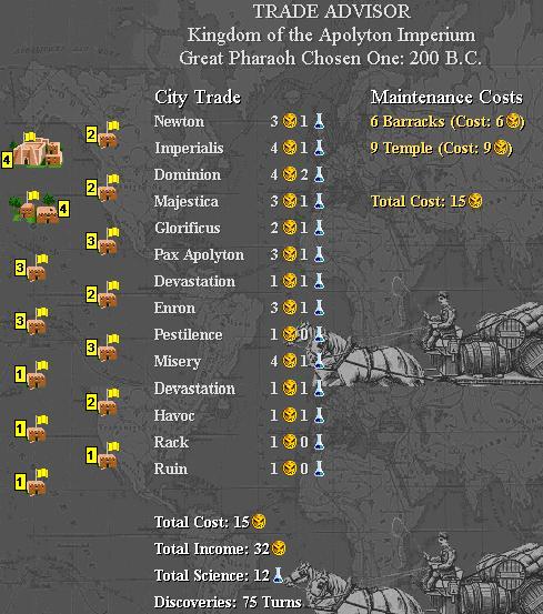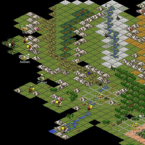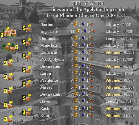Establish city of Ruin. Rename Devastation “Rack”. Rename Osaka “Devastation”. Rush Temple in Rack 76G. Rush Temple in Devastation 62G. Rush Barracks in Glorificus 24G.200 – Rack builds Temple, starts Pikemen. Devastation builds Temple, starts Pikemen. Pestilence builds Barracks, starts Pikemen. Glorificus builds Barracks, starts Pikemen. Pop Hut – None Legion.