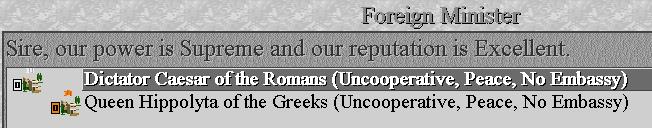 325 – Establish city of Havoc west of Glorificus. Pop Hut 100G. Rush Pikemen in Devastation 19G. Rush Temple in Pax 38G. Greek Emissary offers peace. I refuse. She offers 300G and I accept.