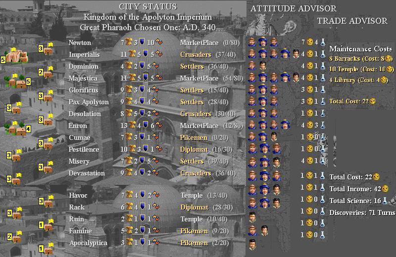 280AD start researching Economics( there were only 2 options and the other one was Navigation, no real use on Arrakis), A legion discovers an advanced tribe near Greek territory: Apocalyptica (very unhappy ppl live there: rush pikemen 120G)