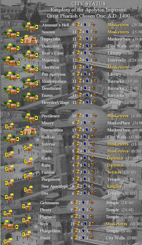 it was called Mendes, but renamed it to Sheol. It’s a size 3 city(3 red faces, black without temple) with a granary, temple and a marketplace.(I sold the Granary, since we have pyramids, for 60G)