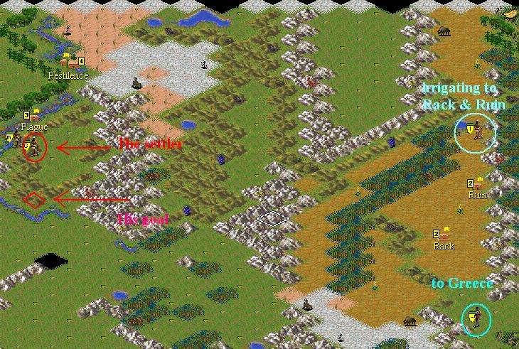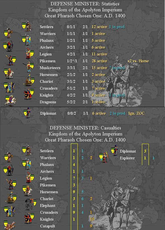 1400AD: It was enough...the Greek knight was killed while attacking, killed 1 Greek catapult which was stationed next to the city, Got a NONE-Dragoon from a hut. Here ends the Rule of Pharao Shade.