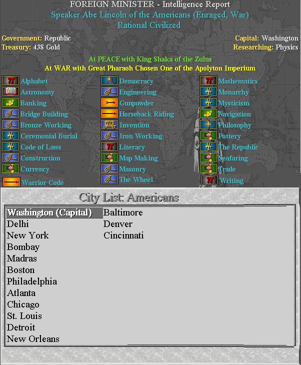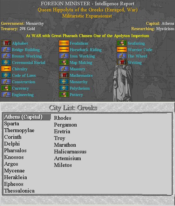 The Greek have 20cities, are a monarchy and are researching Mysticism (the Americans are researching navigation...something they demand for a peace-treaty...maybe we could consider giving it to them so they can research something we also might desire