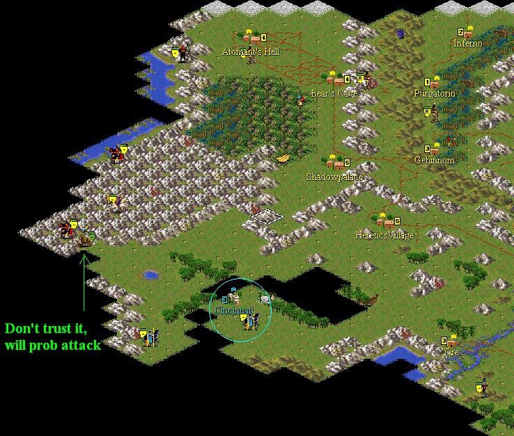 1380AD: killed a catapult near Phlegethon, and a chariot near Sheol(both American), There is a catapult left near sheol, it will be in range next turn), found the American city of Cincinnati, withdraw Crusader(backup will have to come in the future from the knights and other crusader nearby) The city is located very close to Heretics village and Shadowpalace. Got tired of Greek Cease Fire and killed 3 of their knights...I hope the pikemen+citywall’s+river will be enough to keep New Apocalyps safe from the 4 th knight.