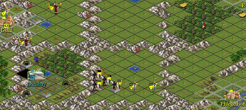 1818 – Greek gov overthrown. Barb Elephant attacks Havok, dies, Rifle gets Vet. Germans and Zulu sign pact against us. Zulus get Steam from Germans. Trade Caravan arrived in St Louis from Nuremberg. Greeks get Steam from Germans. Bribe Greek Dragoon 197G at Cannae to kill a German Dragoon. Destroy Kansas City get 3G but Fanatic healed and fortified at spot (German Dragoon appeared). Bribe Greek Cannon and use it to kill troublesome German Dragoon near Ulandi.