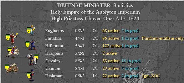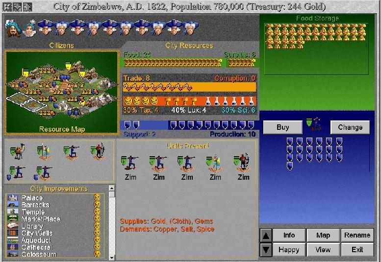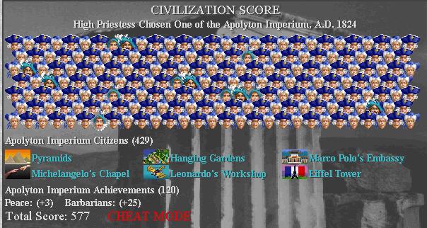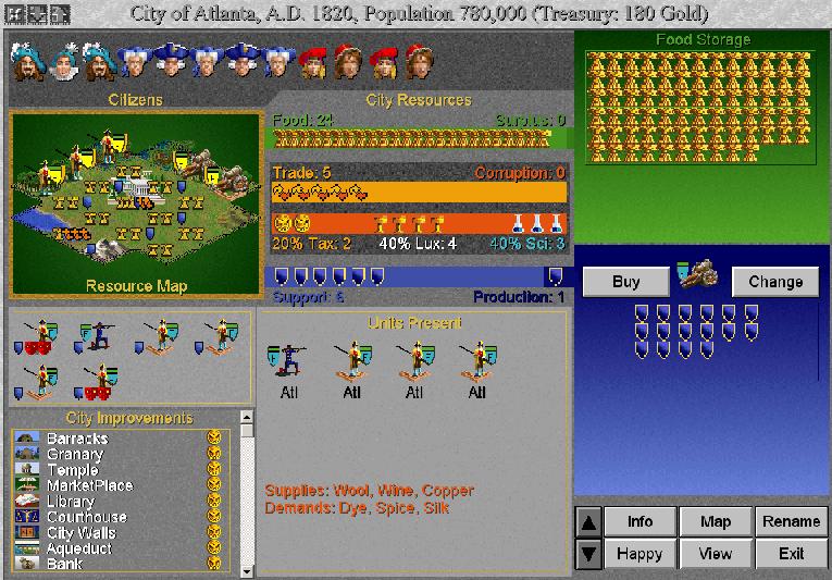 and had to bribe Zulu Musk for 297G to survive. Move units into place to attack Atlanta after using Dip to investigate city (no Cannon, but has Rifle and 3 Musks). Bribe wandering Barb Knight 82G (dip now has a 2-move escort). Kill American Dragoon with Fanatic healed at Kansas City. Find Rhodes and bribe it 450G, get 25G, sell Gran for 60G. Greek gov overthrown.1822 – Lose a Cannon near Ulandi. Greeks become Monarchy. Rus get Steam from Greeks, Greeks get Medicine from Rus. We discover Tactics!